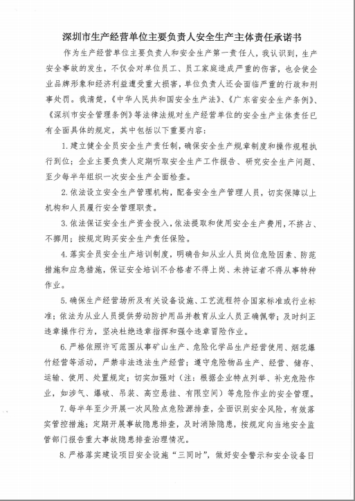 深圳市生产经营单位主要负责人安全生产主体责任承诺书